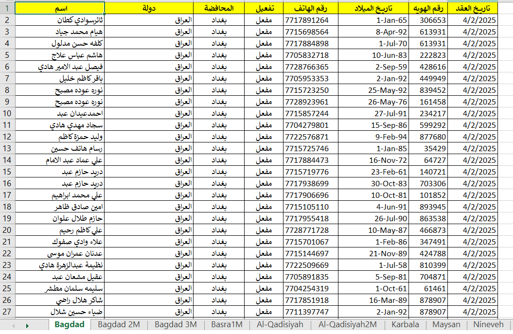 HEADERS : name,nation,Governorate,Activation,Phone_number,Date Of Birth,ID Number, Contract Date, (NOTE ALL Headers ON ARABIC LANGUAGE)